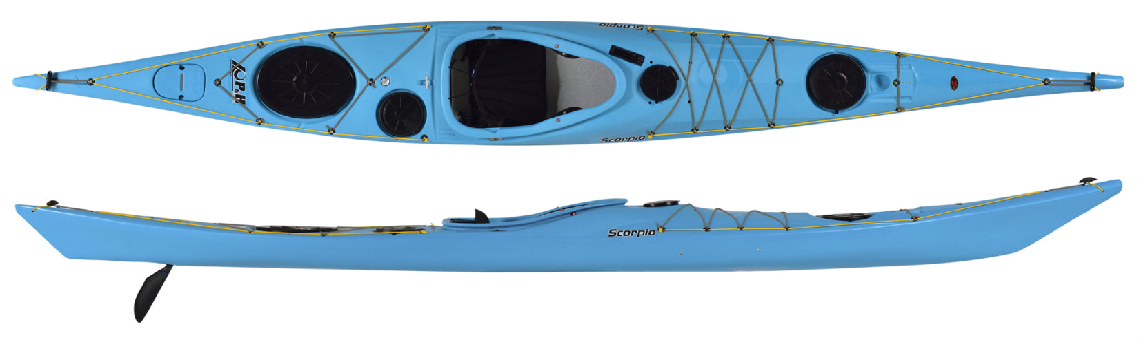 Above the water, the Scorpio's deck has been designed around the requirements of modern sea kayakers. There is a plethora of additional details such as recesses for Silva 70P Compass and for secure split paddle storage, moulded-in inserts to take a kayak sail mast foot. On the rear deck is a large oval hatch and a smaller day hatch each accessing bulkhead storage areas and on the front deck there is a large circular hatch again to access bulkhead storage space. Within easy reach of the paddler there is a mini 'snack' hatch just un front of the cockpit coaming. This four hatch set up makes it easy to organise overnight gear.